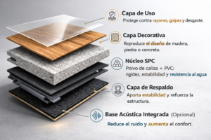 Estructura de un piso SPC: qué lo hace tan resistente y duradero? Composición y Funciones de las Capas en un Piso SPC Un piso SPC,
